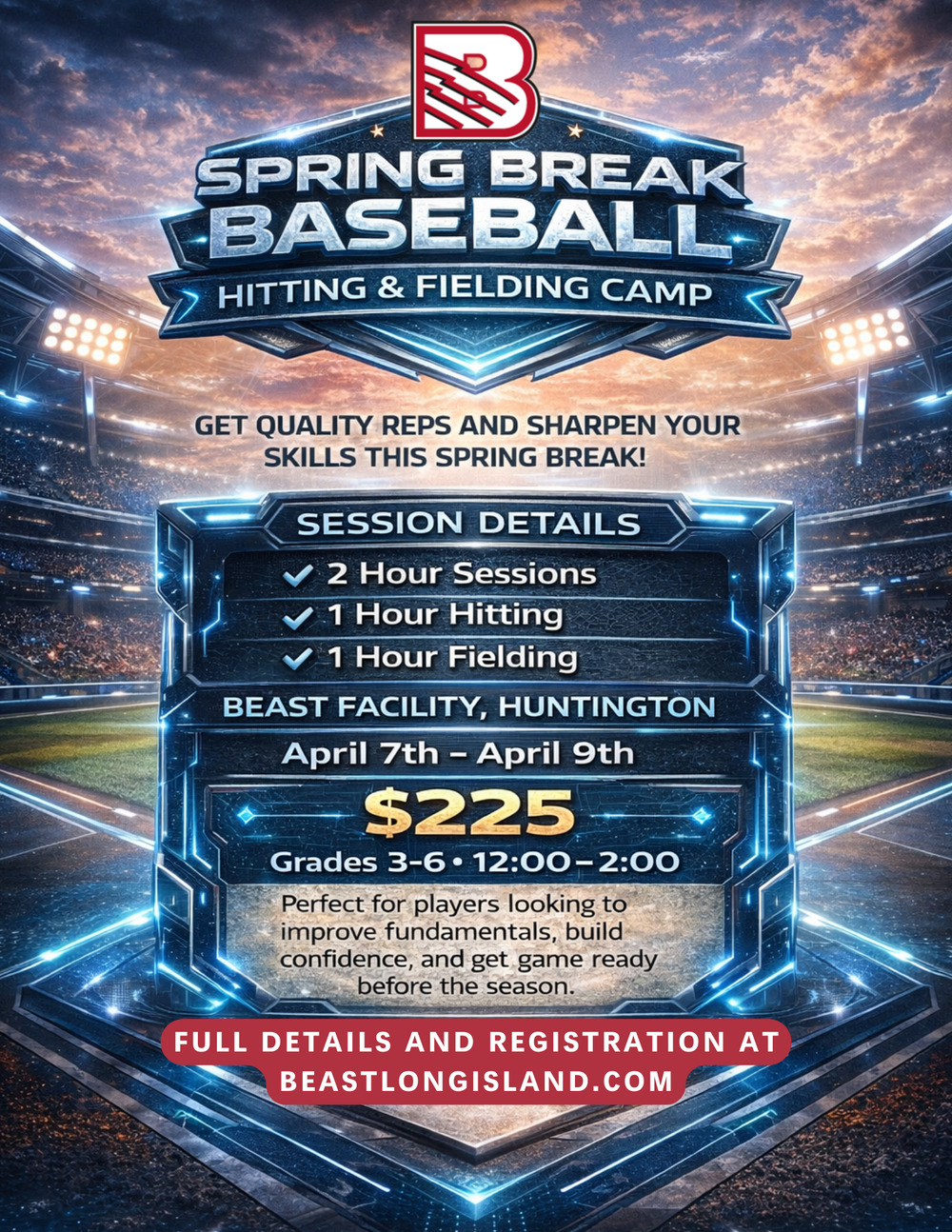 Get your work in while school is out! Join the TJ Riccio & the BEAST coaching staff to work on hitting and fielding during this two hour instructional clinic. 3rd-6th GradersTuesday, April 7th - Thursday, April 9th 12pm-2pmBEAST Training Facility, Huntington $225 per playerOpen to players from all organizations but space is limited. REGISTER HERE...